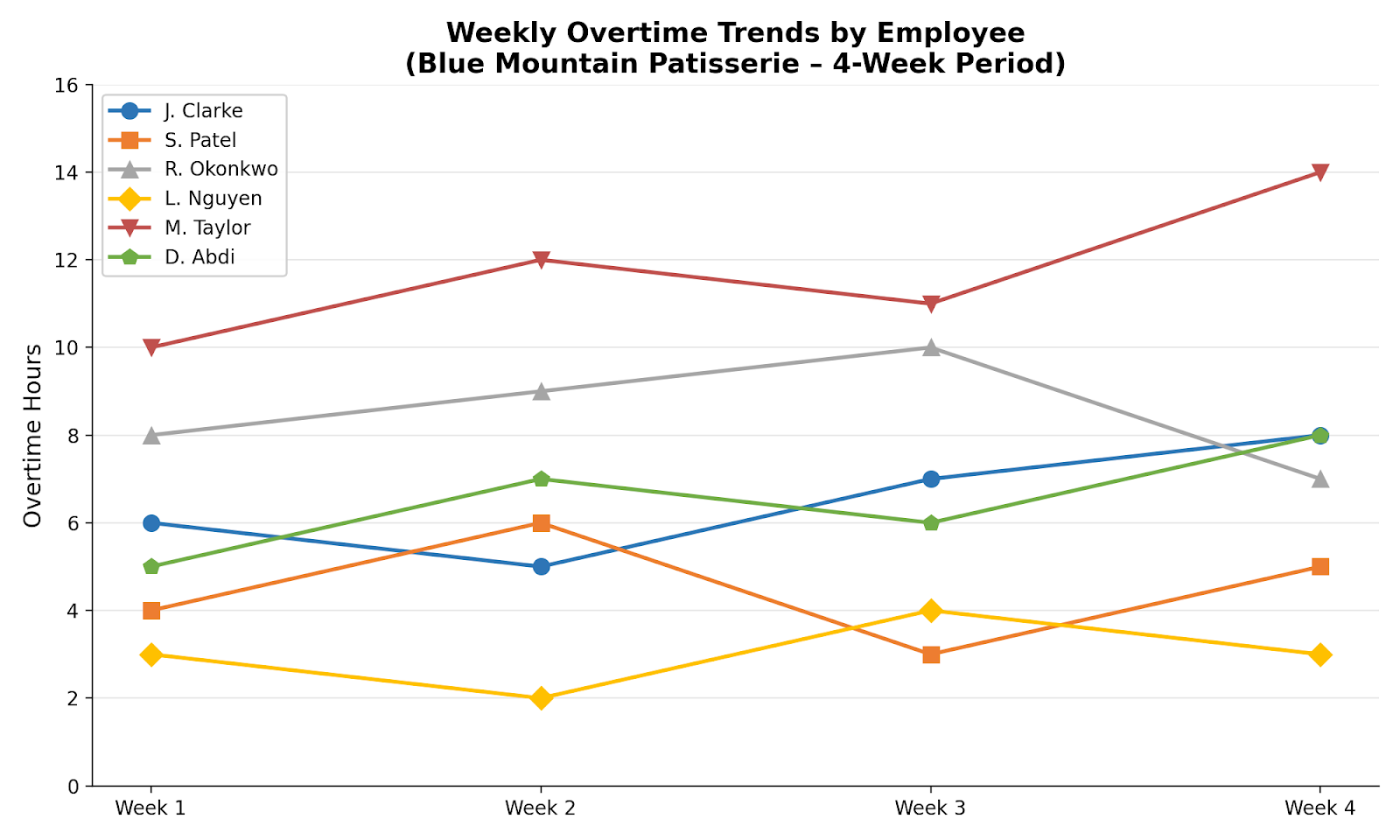 Figure 2 reveals the trajectory of overtime over the four-week period. M. Taylor’s overtime shows a concerning upward trend, rising from 10 hours in Week 1 to 14 hours in Week 4, suggesting that the workload imbalance is worsening rather than stabilising. R. Okonkwo’s pattern shows some variability but remains consistently high. L. Nguyen’s overtime remains flat and low throughout the period.
