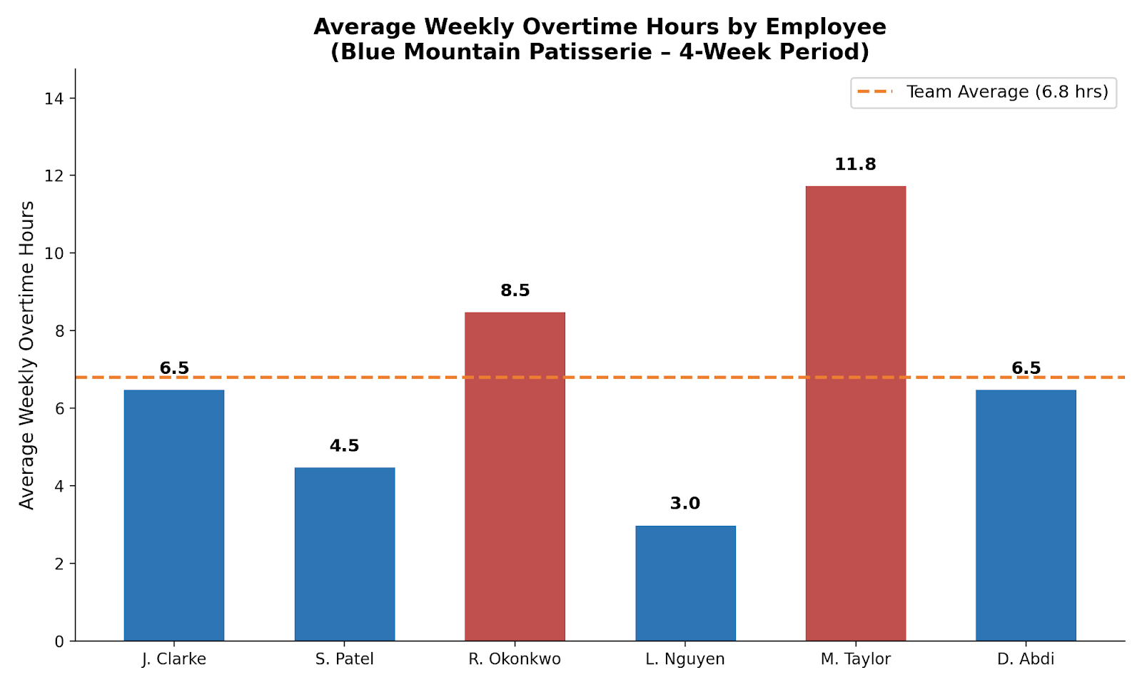 Figure 1 clearly illustrates the disparity in overtime distribution, with M. Taylor’s average weekly overtime (11.75 hours) standing significantly above the team average of 6.8 hours. The red shading highlights employees exceeding 8 hours of average weekly overtime, providing an immediate visual indicator of risk areas.
